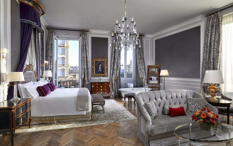 Situated right along the Arno River, the hotel provides not only spectacular views but also nearby access to renowned fashion houses such as Ferragamo, Cavalli, Gucci, and Pucci. Overlooking some of the most famous landmarks in the city, The St. Regis provides the perfect blend of location and luxury. Be sure to take in the hotel’s decadent ballroom, enjoy a meal at the Winter Garden by Caino, and indulge in a spa massage after a workout in their 24-hour fitness center. Pricing starts at 469 euros per night for a single room and goes all the way up to 5,116/night for a Presidential suite.